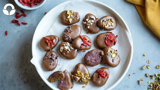 Just because you’re plant-based or vegan, doesn’t mean you can’t enjoy yummy Easter eggs. These date chocolate ‘eggs’ are healthy, plant-based date eggs for Easter, or any day! These are our homemade take on the beloved ‘Reeses Peanut Butter Eggs’, using easy ingredients found at your local Food Lover’s. It’s as simple as dates, almonds and dark chocolate. You may have seen these or this combo before, but we had to try it for you, and no matter how many times it’s done, it’s a killer combo! Trust us, these did not last long in our test kitchen.