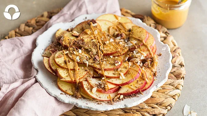 Get your apple a day and satisfy that sweet tooth with this healthy snack idea; Apple nachos! Apple nachos (a fancy way of saying apple slice drizzled with peanut butter sauce and toppings) is an A++ for a healthy sweet treat. Make it gourmet and serve it to a crowd for dessert at your next tapas night. Use different varieties of apples to bring in beautiful colour, taste and textures.