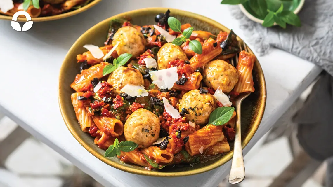 Combine the warm cooked pasta sauce with the cooked pasta and stir the baby spinach through so it wilts. Top the delicious pasta with your baked chicken meatballs. Garnish with sundried tomatoes, black olives, Parmesan cheese, fresh basil and a drizzle of lemon oil.