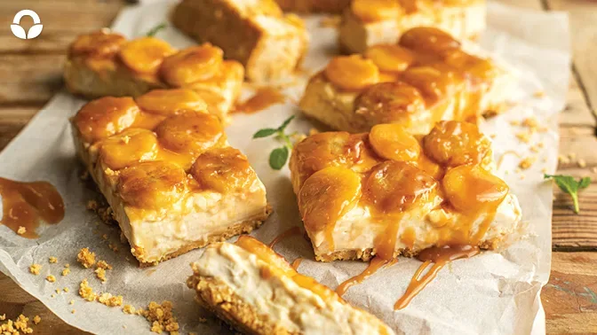 Creamy, silky smooth and sweet, these cheesecake bars are perfect for an on-the-go treat, to pack for a picnic or serve as dessert at your next dinner party. A crunchy coconut base, with a smooth cheesecake filling and topped with sweet caramelised bananas, heaven on a plate right?! Don’t be scared of the gelatin, it’s easier than you think, just follow the steps.
