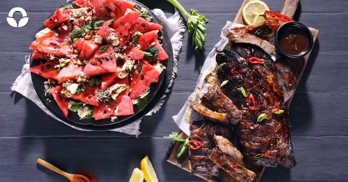 Are you ready for easy summer entertaining and a long, laidback alfresco lunch? These ribs are smothered in a delicious, sticky barbecue marinade and slow-cooked in the oven until fall off the bone tender. This refreshing watermelon, mint and feta salad is the perfect accompaniment. The sweetness and acidity of watermelon and balsamic cut through the richness of the ribs.
