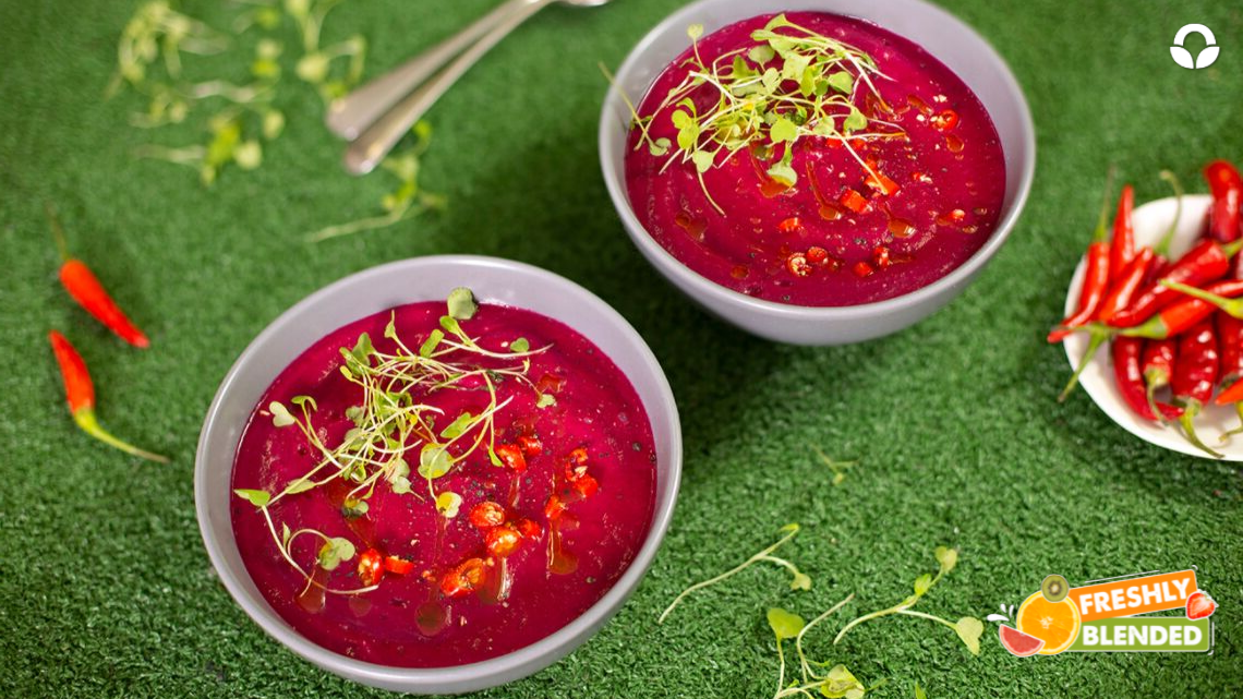 Garnish your soup with fresh red chilli (optional) and micro rocket leaves.
