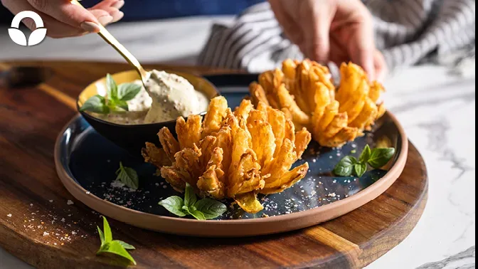 No, you can try a baked/roasted or air-fried version of a blooming onion. Dip the onion in the egg wash, then dredge in breadcrumbs, salt & pepper, or almond flour, and baked until golden (about 18 – 20 minutes).