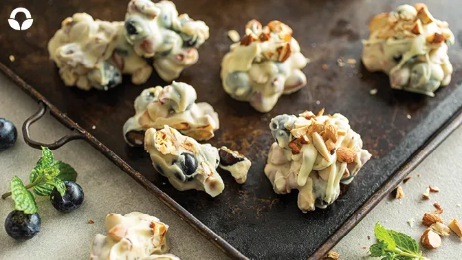 Are you a lover of those delicious peanut chocolate clusters? Well, you are going to love these. We’ve taken it up a notch with this recipe. These blueberry, almond and white chocolate clusters are super simple, quick and easy to make. This recipe will fix that sweet tooth. Make these blueberry almond clusters even healthier as a sweet snack for that health nut, by substituting the white chocolate for dark chocolate.