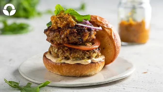Halve and butter the buns, then heat a pan on a high heat and toast them. On the bottom bun, spread some of the sultana mayo, followed by the patty, tomato, red onion, fried egg. Topped with gooseberry chutney, banana slices and rocket.
