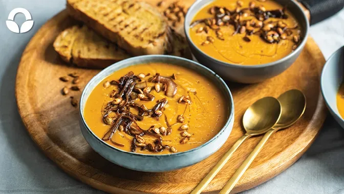Autumn’s chillier weather is upon us, and this roasted butternut and caramelised onion soup is just the recipe you need to tuck into! Mix the pumpkin seeds with some spices to add a little punch to your crunch in this wholesome soup.