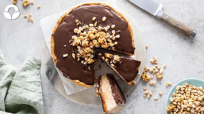 Take the ice cream cake out of the freezer and remove from the cake tin. Pour the cooled chocolate ganache over and top with peanuts and peanut brittle. Serve frozen and enjoy!