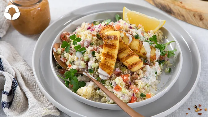 Experience the vibrant flavours of Greece with this delectable Chopped Greek Halloumi Salad. Featuring fluffy couscous, refreshing cucumber, zesty red onion, and juicy tomatoes, this salad is a burst of Mediterranean goodness. Tossed in a creamy Knorr Creamy Greek Salad Dressing, it brings a delightful tang and creaminess to every bite. To add a savory twist, pan-fried slices of halloumi cheese are layered on top, offering a deliciously satisfying contrast of textures. Seasoned with salt and black pepper, this salad is a perfect blend of flavors that will transport you to the sunny shores of Greece.