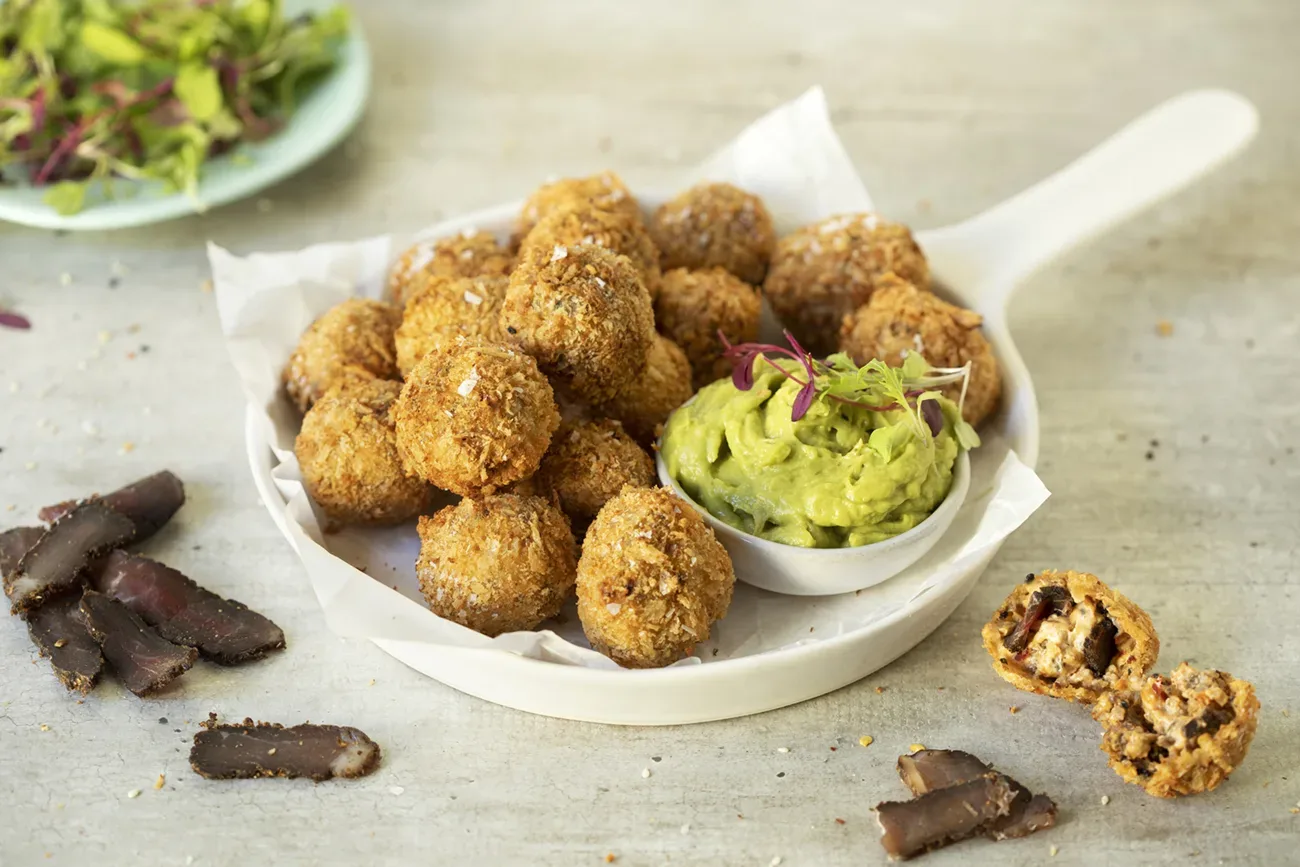 Expert tip: Remember, keep one hand “wet” and the other “dry” to prevent sticky, messy hands. Garnish with baby salad leaves and serve the biltong balls with the avocado dip and extra biltong slices.