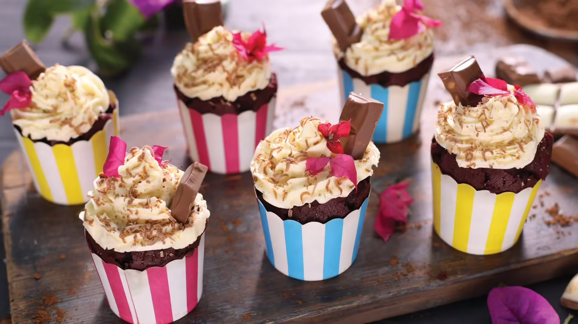Spoon the icing sugar into a piping bag and using a circular motion, pipe the top of each cupcake. Push a block of chocolate into the icing and decorate with an edible flower (optional).