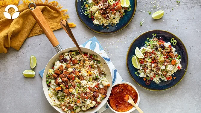 Serve the egg fried rice with the orange glazed gammon and garnish with almonds, spring onions, sesame seeds, sesame oil, and micro greens. Serve with lime wedges.