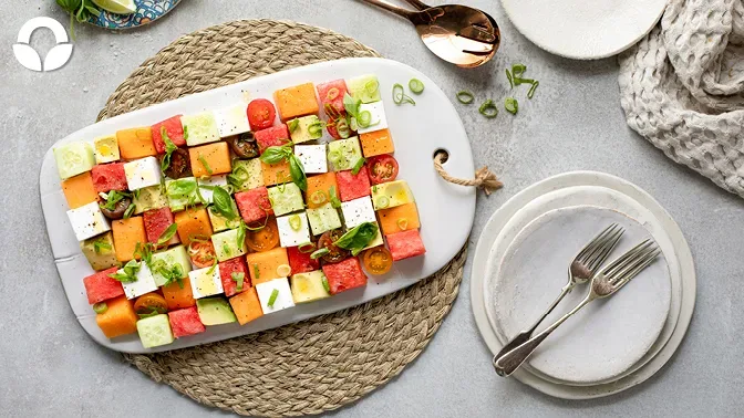 On a large platter or plate, arrange the cubed melons, avocado, cucumber, tomatoes and vegan cheese or feta by alternating between them until the platter is covered.