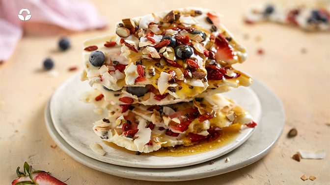 Frozen yoghurt bark with fresh, seasonal berries is a delicious, fun, and healthy dessert or an exciting and energy-boosting snack! It is a great way to add more fruits into your day too, plus the whole family will love it! You can even change up flavours with different flavoured yoghurts. In this frozen yoghurt bark recipe, we use full cream plain yoghurt paired with fresh berries, coconut, cacao nibs and coconut flakes.