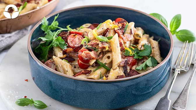 Boil a large pot of salted water and cook the penne pasta for about 12 – 15 minutes or until al dentè. Drain, drizzle with olive oil and set aside until needed.