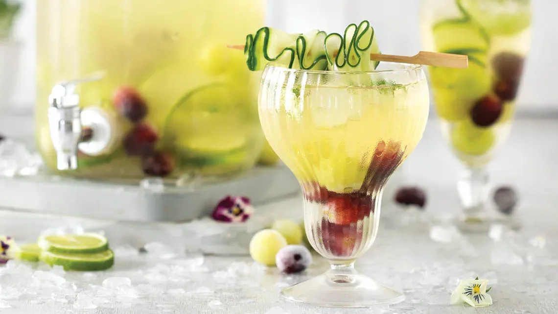 Using a vegetable peeler, peel the cucumber lengthwise to create ribbons. Place the cucumber ribbons, frozen grapes and lime rounds into the ice tea mixture and garnish with a good hand full of fresh mint and crushed ice.