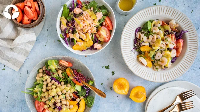 One versatile, colourful and hearty base salad, which can be finished with any protein to make it a brand-new salad.