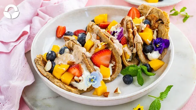 Have you tried a pancake taco? This recipe makes them into a healthy breakfast so you can enjoy pancakes for breakfast without the guilt. Simple banana pancakes with bananas, egg and oats made into thicker pancakes, made into a ‘taco’ shell by filling them with your favourite summer fruits, and drizzled with nut butter and honey.