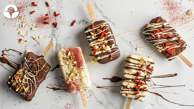 Melt both chocolates in separate bowls. Dip the ice creams into the melted chocolate and decorate with extra chocolate, coconut flakes, goji berries, almonds, and berry beetroot powder to your liking.