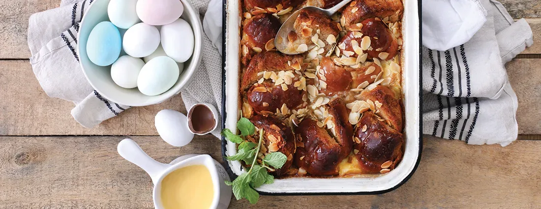 A new take on the traditional bread and butter pudding – spoil the family and use those last almost-stale hot cross buns left over from Easter weekend.