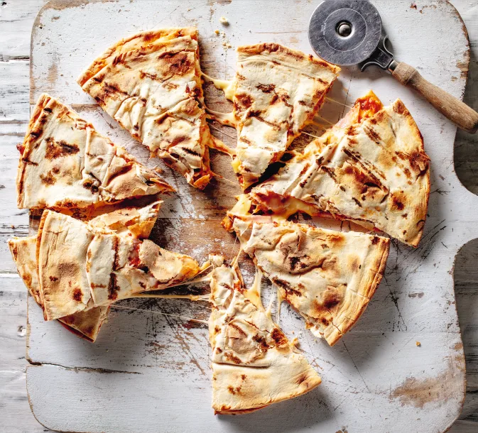 Once you have achieved the perfect pizza, take it off the grid, slide it onto a wooden board and slice. Serve immediately.