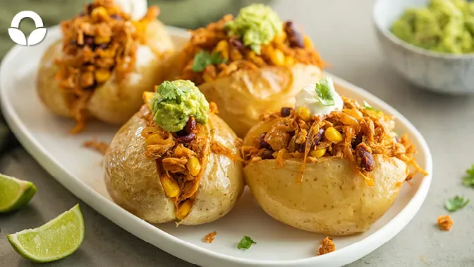 Who doesn’t love a baked potato? This loaded potato recipe is perfect to make when you grab that veg combo or pocket of potatoes from Food Lover’s! A filling of Mexican flavoured chicken and beans is loaded into perfectly baked potato and topped with homemade guacamole. These are a perfect weeknight meal, or serve them on a platter for friends.