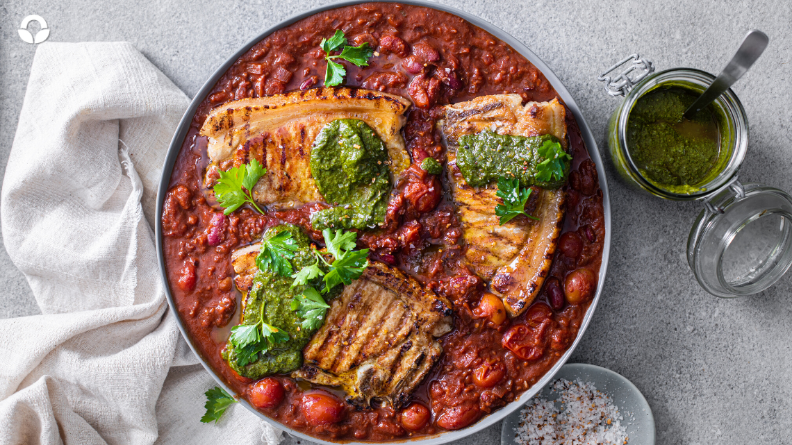 What is Chermoula? It’s a marinade or relish used in Algerian, Libyan, Moroccan, and Tunisian cooking. Packed with spices and full of flavour, this Chermoula is served with local South African pork Chops and topped with a homemade Green Harissa.