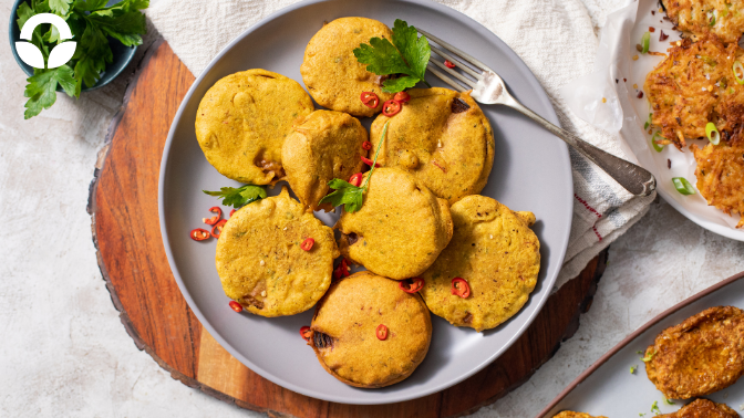 Onion Pakoda (Pakora) is an Indian version of a fritter, a vegetable coated in gram flour & fried. In this Onion Pakora recipe, we have used whole slices of onions coated in chickpea flour, spiced with turmeric and chillies, and then shallow-fried. These make a great side dish with your burgers or served on a platter.