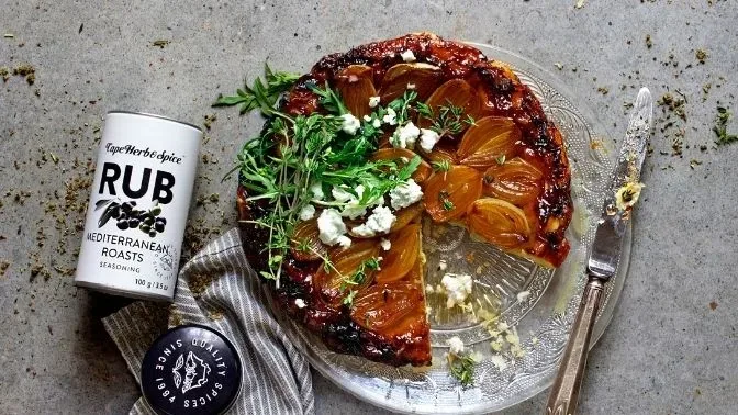 We’ve never encountered a Tarte Tatin we don’t like. What’s not to like. Puff pastry, butter, a hint of sugar. Hmmm. Mostly of course they’re made with fruit for dessert. But root veggies are a brilliant alternative to turn this French classic into a gorgeous savoury meal. Cape Herb & Spice decided baby pickling onions would be perfect to use with their Mediterranean Rub. A hint of vinegar cuts the sugary, buttery richness, making for a sweet and sour delight.
