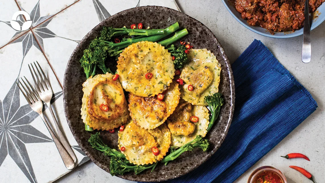 Plate the ravioli with steamed broccolini and dress with a drizzle of chilli oil.