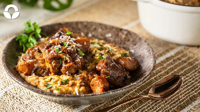 Stir constantly and allow the liquid to be absorbed by the rice. Add the stock in small batches and stir in between for the risotto to become creamier. Once all the stock is absorbed, add the cream and allow to absorb. Add the cheese and the entire contents of the oxtail.