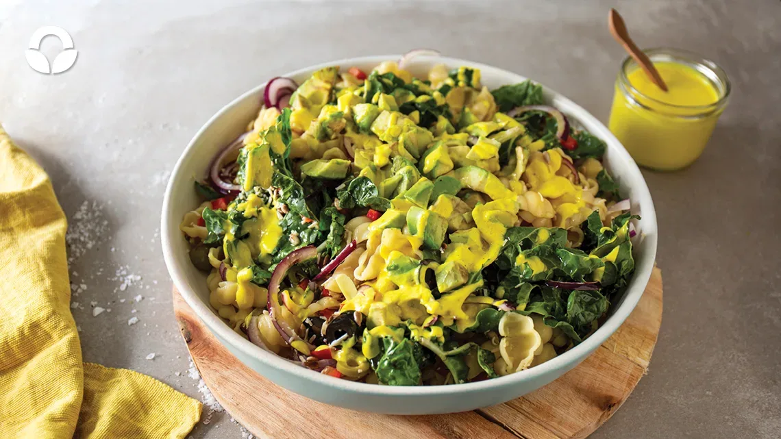 A super simple meal with loads of immune-boosting ingredients. A quick pasta salad with spinach, red pepper, tossed through a simple turmeric and yoghurt sauce/dressing.
