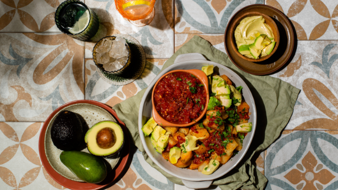 A classic tapas dish, usually served with a spicy tomato sauce. We are elevating it to superstar status with the addition of a delicious avocado crème to balance the fiery sauce. For a shortcut the homemade tomato sauce can be replaced with tomato chilli jam.