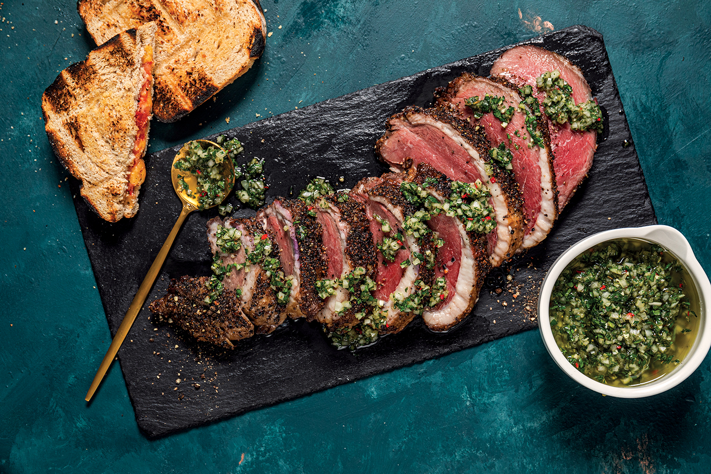 Drizzle the chimichurri sauce over the steak strips and serve with your favourite braai sides.