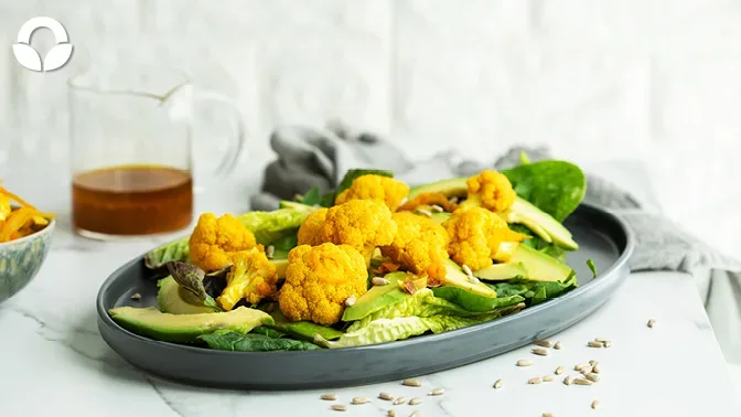 Pickled cauliflower packs a punch atop a fresh seasonal salad, this one is a beautiful Autumn salad. Autumn is for avos after all, and that creamy avo pairs perfectly with a cauliflower pickle. This pickled cauliflower recipe is inspired by a Cape Malay pickle, using curry powder, turmeric and aromatic spices. The cauliflower gets this beautiful sunny yellow colour, making your salad pop with colour, flavour and nutrients! Time to get pickling and eat the rainbow.