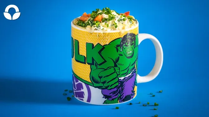 An omelette in a mug is a quick and easy protein-packed breakfast with endless options for flavour additions, and you can whip it up at work! Inspired by The Hulk, (and perhaps Dr. Suess with green eggs) we are making use of the beautiful Marvel mugs to give a good energy punch in the morning! It’s as simple as eggs with a little extra nutritious ingredients. Try this Protein Punch Omelette in a mug, inspired by The Hulk.