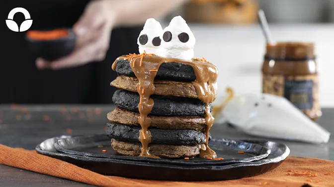 Stack the flapjacks, alternating black and orange, and drizzle the peanut butter over. Pipe the ghosts on the top and place the choc chips for their eyes. You can add a drizzle of honey too for a sweeter flapjack stack.