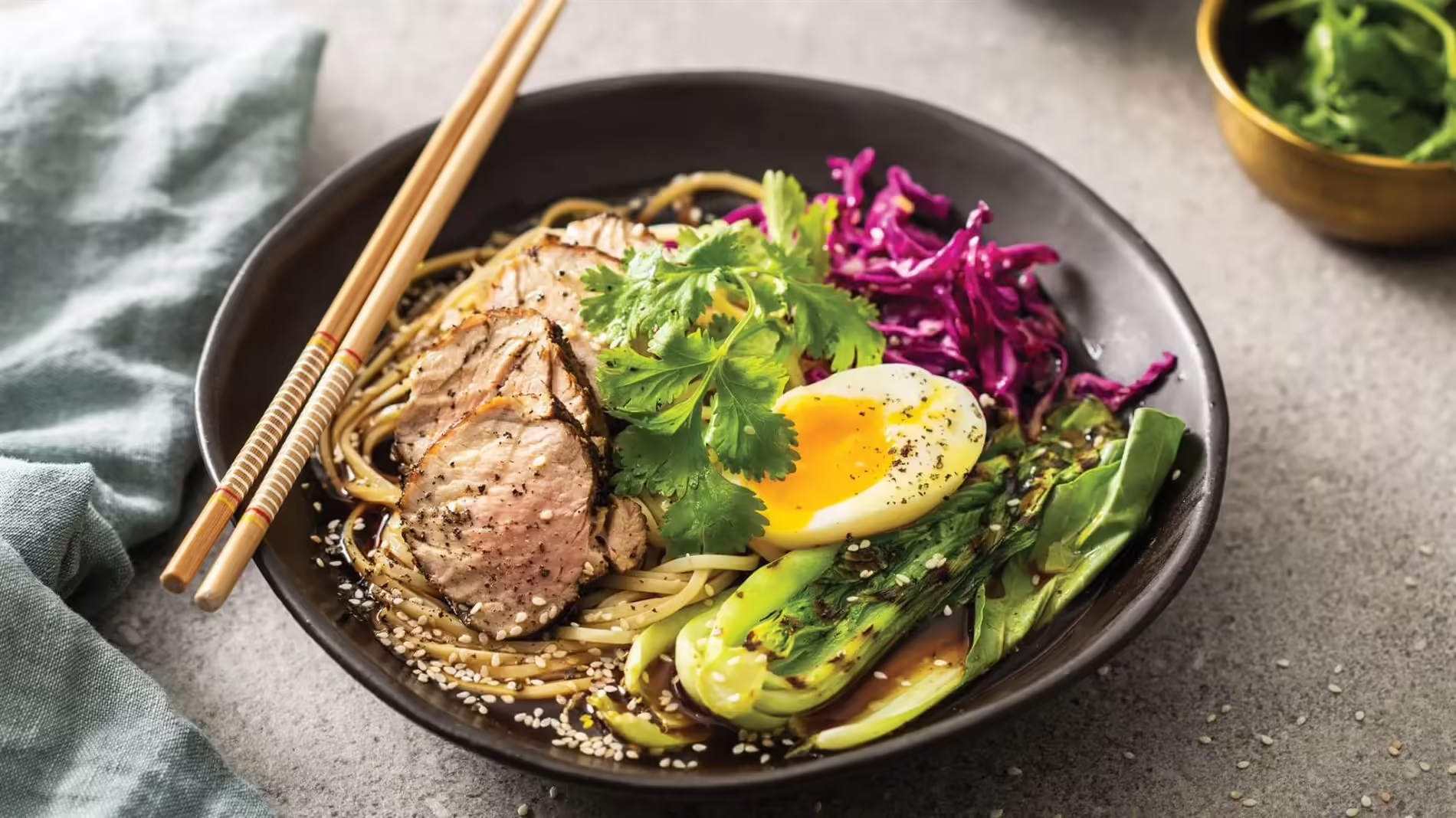 Strain the broth, keeping the liquid & discarding the solids. Add the liquid to your bowls using a ladle. Slice the pork and add it with the eggs to the bowls.