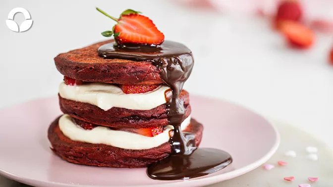 What could say I love you more than a red velvet pancake stack drizzled in melted chocolate sauce?! This drool-worthy recipe is one to save. Fluffy red pancakes, topped with fresh whipped cream, berries and decadent melted chocolate…now we’re talking. Let’s not waste any more time, make this recipe now.