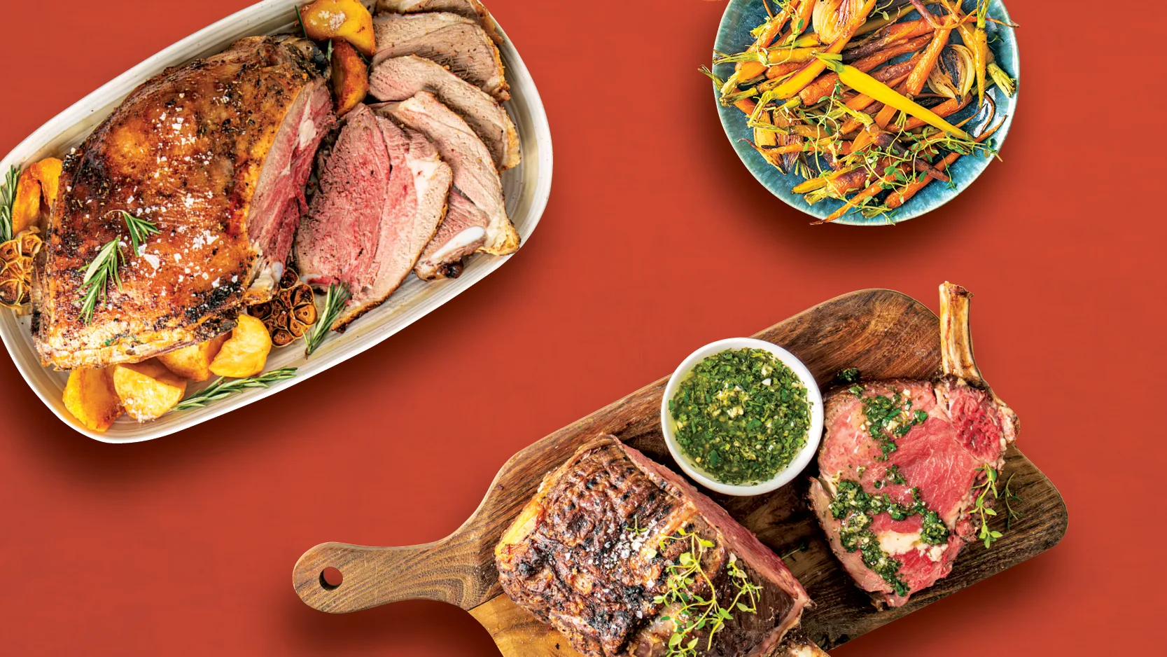 Place the leg of lamb into the roasting tray and prepare the lamb by making 2cm cuts randomly into the meat. Remove some of the garlic cloves from the bulb and randomly place into the cuts. Then divide a smaller sprig of rosemary between them. Rub the meat with some olive oil and season with salt and pepper.