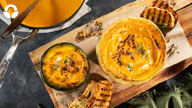 Serve the soup in the hollowed-out pumpkin and garnish with the spiced pumpkin seeds, basil pesto and fresh thyme.