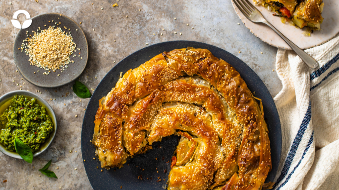 Coil the phyllo vegetable rolls to make spirals. Brush with olive oil and sprinkle with sesame seeds. Bake for 30 to 40 minutes or until pastry is golden brown and crispy to the touch.