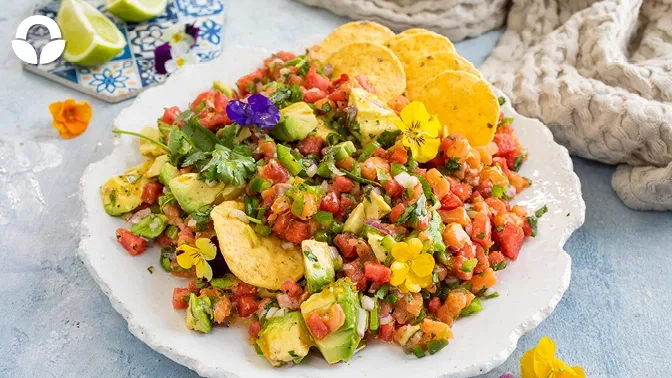 Serve the watermelon and salmon ceviche with the nacho corn chips and garnish with micro herbs or edible flowers.
