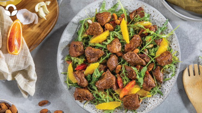 In a bowl, add ostrich, orange zest, orange juice, garlic, and soy sauce. Toss together and cover the bowl. Place in the fridge for an hour or even overnight. Remove the marinated ostrich from the fridge. Add a tablespoon of coconut oil to a pan over high heat. Add the ostrich to the pan and sear on each side for 2 minutes. Remove from the heat and allow to rest for five minutes. Once rested, season to taste. Using a sharp knife, remove the membranes of the orange segments. In a medium bowl, layer rocket and fresh orange segments along with ostrich. Top with toasted almonds and drizzle with olive oil to serve.