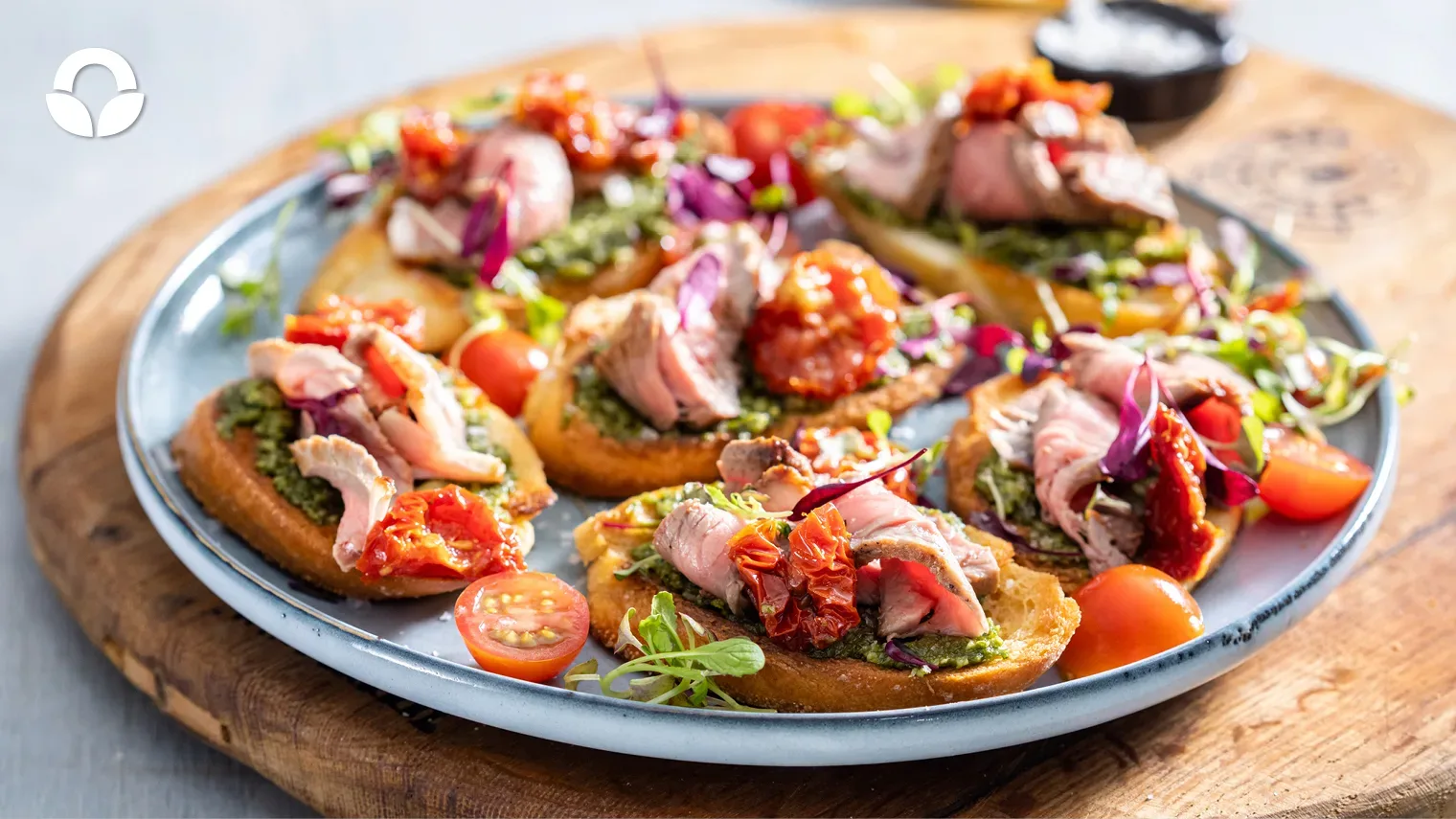 Spread basil pesto over the toasted bread. Add seared steak onto the basil pesto and top with sundried tomatoes and fresh tomatoes. Garnish with micro herbs.
