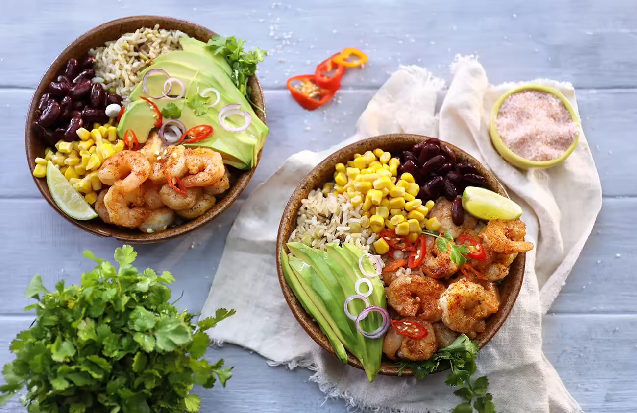 These bowls are not only healthy and full of nutrition, they are also totally yummy. Who can resist the big bold flavours of spicy prawns paired with tangy salsa beans, creamy avocado and corn, all served on a bed of nutty brown rice. These burrito bowls are guilt free, mouthwatering pleasure.