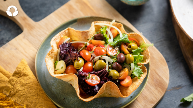 Fill the tortilla bowl with lettuce, tomatoes, onion and olives and serve with your favourite salad dressing.