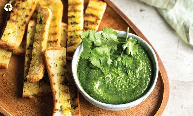 To arrange your platter, arrange the potato and carrot peels on a serving platter along with the broccoli and cauliflower steaks, crostini and sliced radishes. Serve with the leafy pesto and you have a great snack platter.